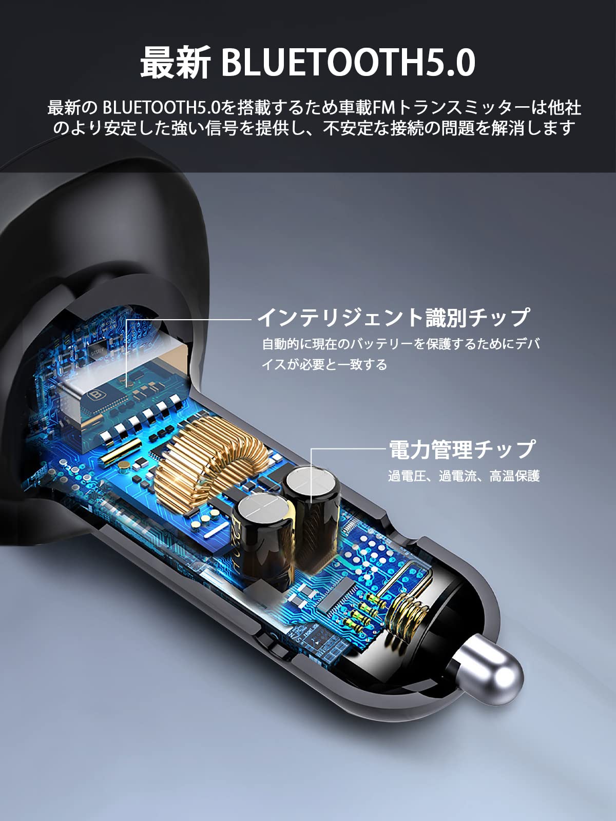 - 【ブルートゥースV 5 .0包括的な互換性】迅速かつ容易にペアリング、ブルートゥースV 50テクノロジーは、あなたの電話または他のブルートゥース・デバイスとブルートゥースFM Transmitterアダプターの間で正確に安全な接続を提供します、広くブルートゥースと12 – 24 Vの車を支持するすべての装置と互換性を持つ。