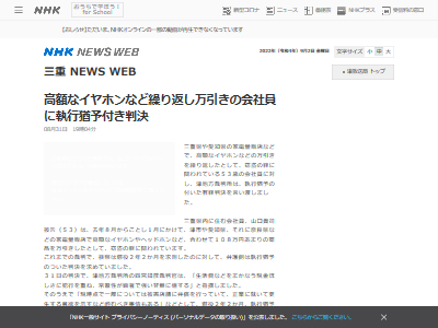 一名53岁的上班族因多次在三重县和爱知县的家电大型零售商店盗窃高价耳机而被指控盗窃,被津地方法院判处缓刑。