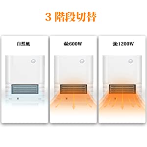 - 【3段階切替&たくさん場所活躍】部屋の広さや天候に合わせて、ヒーターの温度を調整できます。自然風(5w)/中温風(600w)/高温風(1200w)の3段階が調節可能