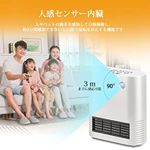 - 【人感センサー付きの最新型】人感センサーモードがあり、製品から3mの範囲で人やペットの動きを感知して自動稼動し、また、3分間以内に人やペットの存在を感知できない場合は自動的にスタンバイモードに入り、電力を浪費しません。スタンバイモードで8時間を経過すると自動に停止する、ヒーターの消し忘れによる事故を防ぎます。忙しいあなたに思いやりのあるデザインです