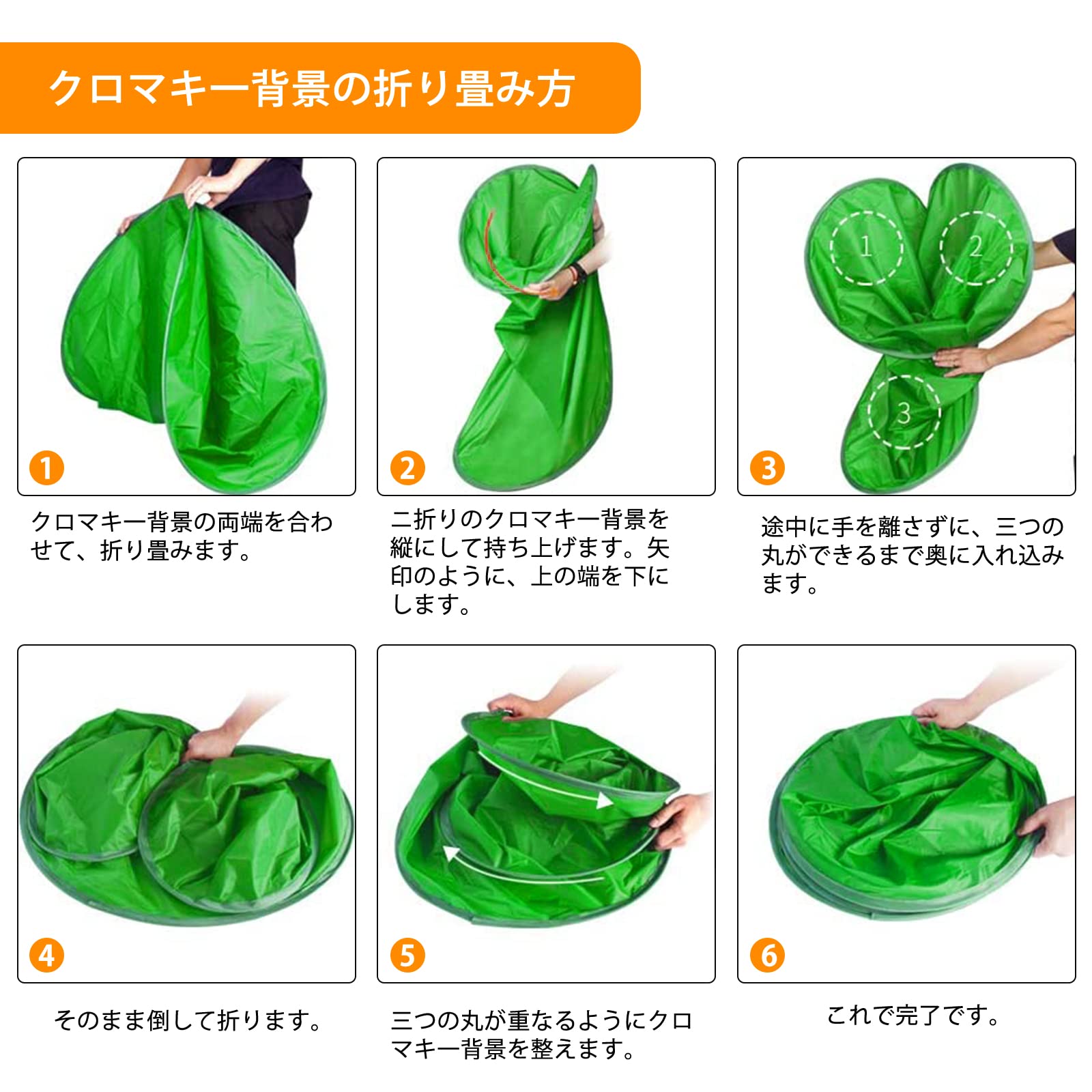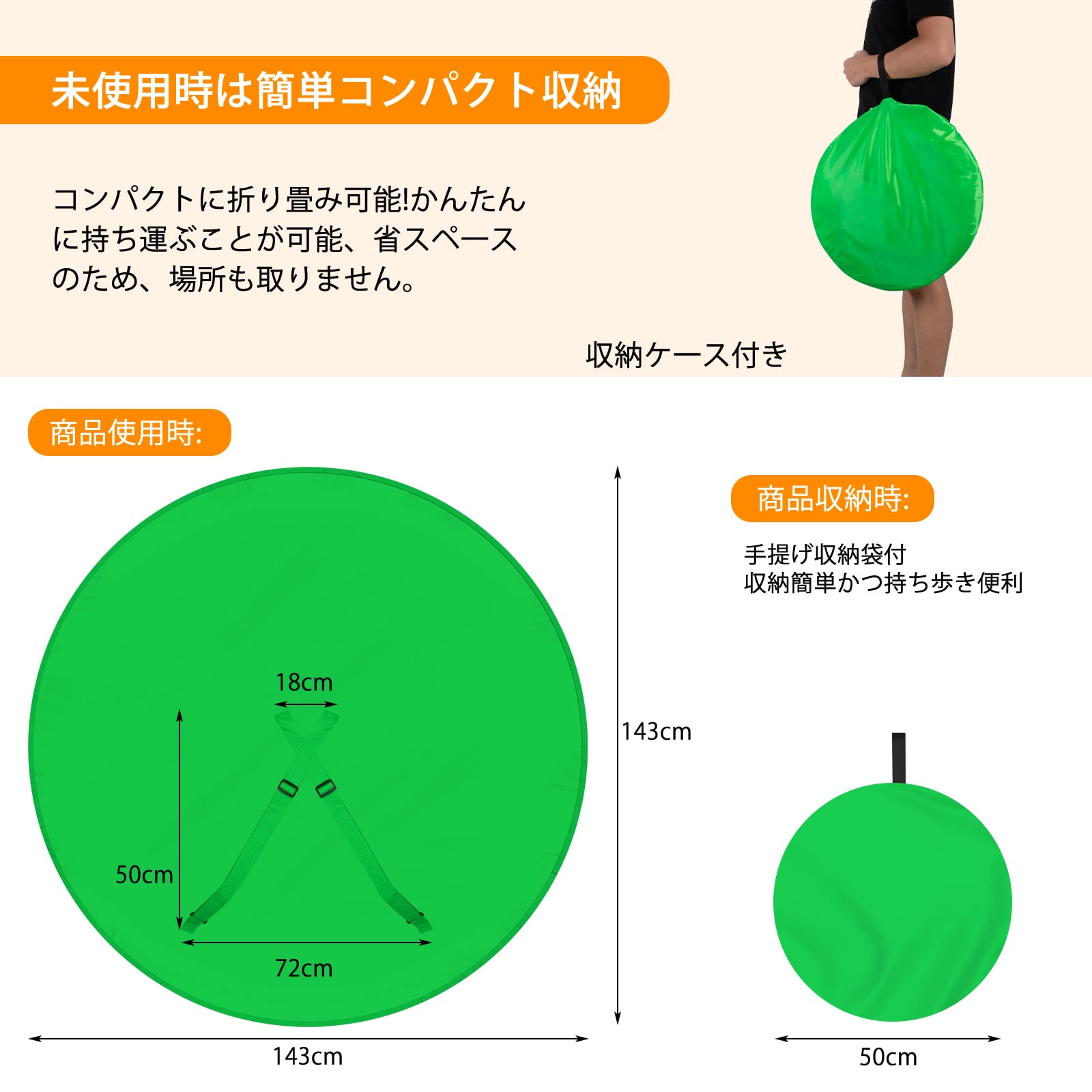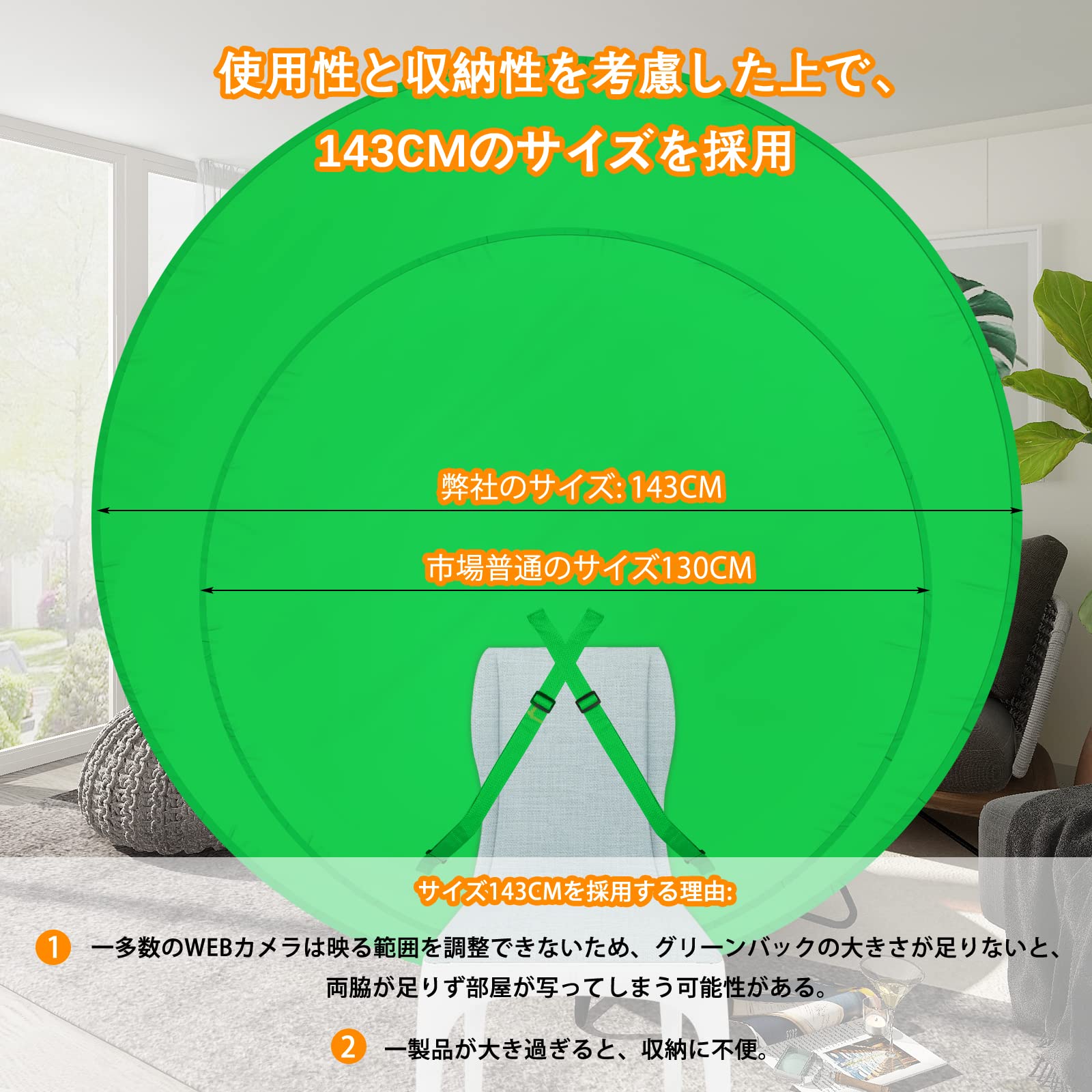 - 【商品仕様】:製品名称: グリーンバック(背景スクリーン) 商品使用時:直径143センチ(縦143cm、横143cm) 商品収納時:直径約54センチ (縦54cm、横48cm、厚0.5cm) 重量:450g 素材:ポリエステル製 ★高品質なポリエステル材質を採用しておるので、背景がうまく合成できるから、より素敵な撮影効果を楽しめます。ご注意:特殊な形の椅子や背もたれが低い椅子に対応しないです。