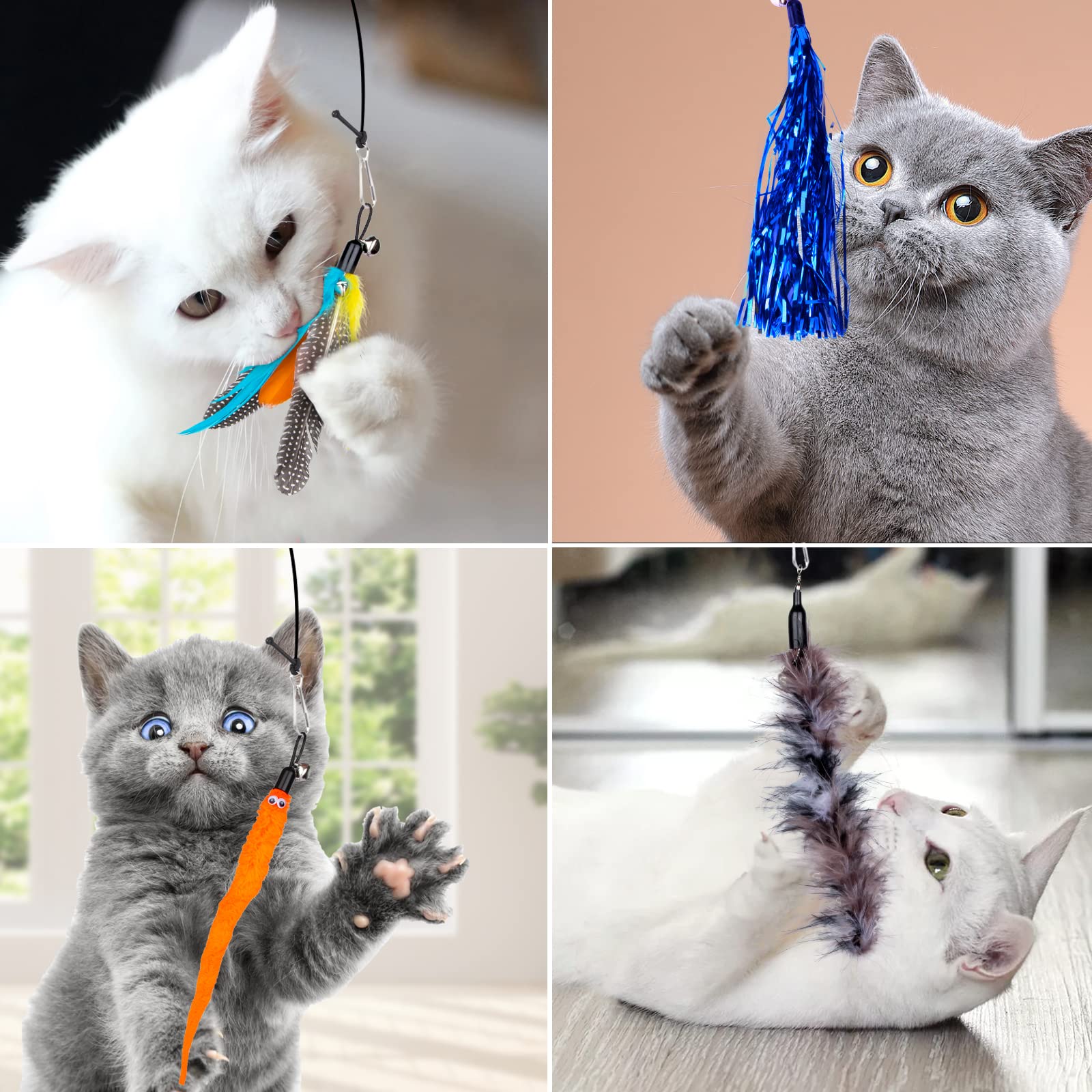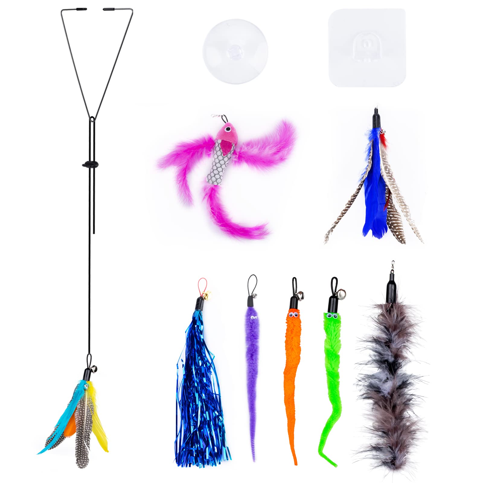 - 【猫じゃらし12点セット】長さを調整できる弾性ロープ1本、吸盤/三角クリップ/貼付フック各1個、毛虫3本、交換用羽玩具3本、リボン1本、鳥のおもちゃ1本、合計12点人気の猫おもちゃセットです。様々な形があり、カラフルなネコおもちゃは猫ちゃんの興味を大いに引きつけます。12点セットの遊べるおもちゃで非常に経済的で実用的なセットです。