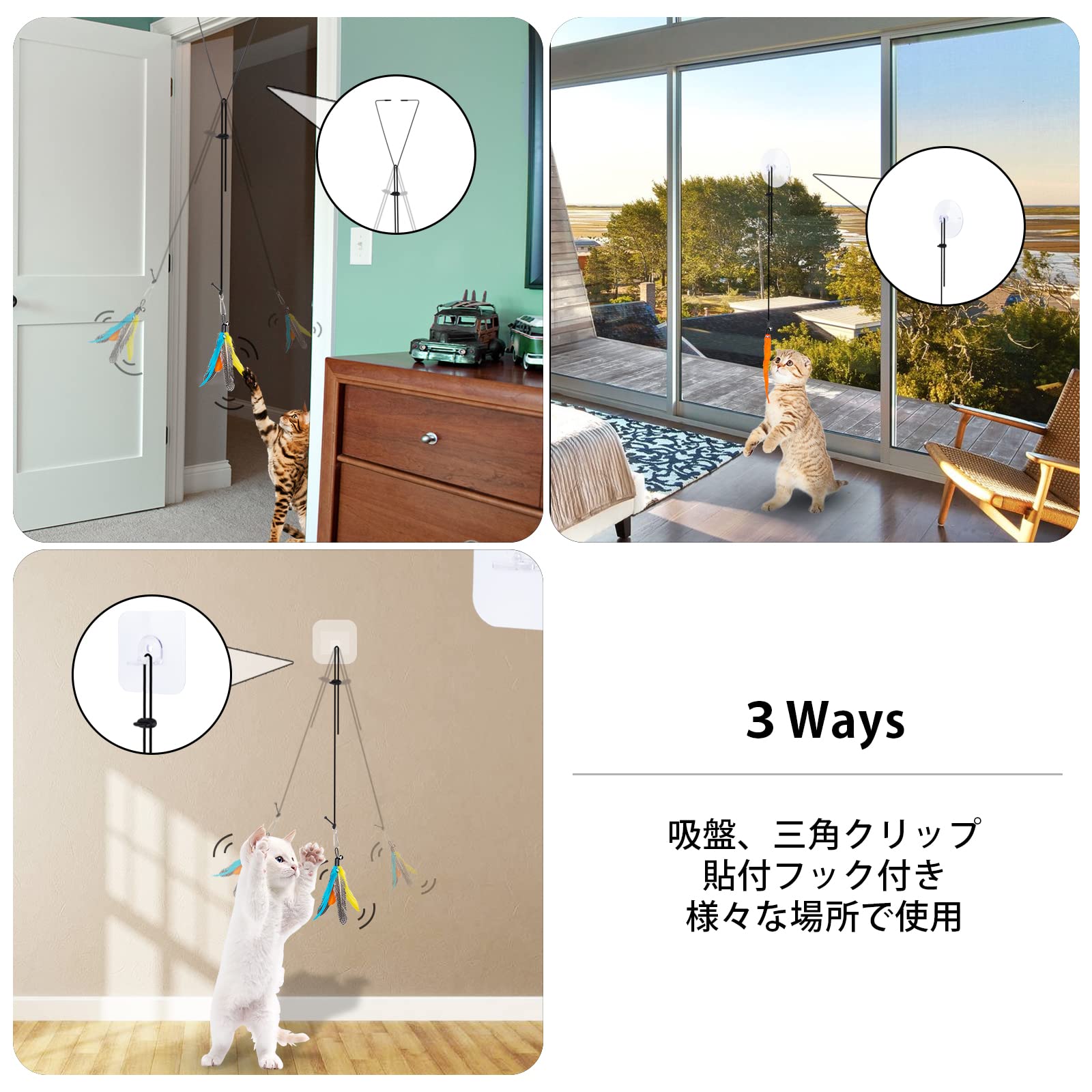 - 【3Ways猫遊び】猫おもちゃセットには、吸盤、三角クリップ、貼付フックの3種類フックがセットされて、多種の取り付け使用方法に使用しています。ドア、壁、床、卓上、リビング、寝室など様々な場面で幅広く使用できます。