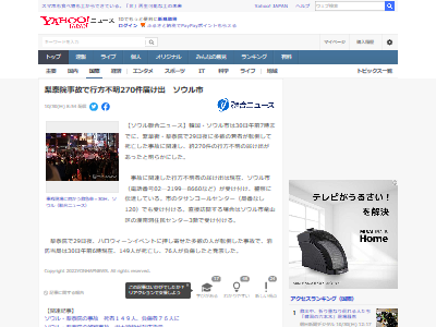 【ソウル聯合ニュース】韓国・ソウル市は30日午前7時までに、繁華街・梨泰院で29日夜に多数の若者が転倒して死亡した事故に関連し、約270件の行方不明の届け出があったと明らかにした。