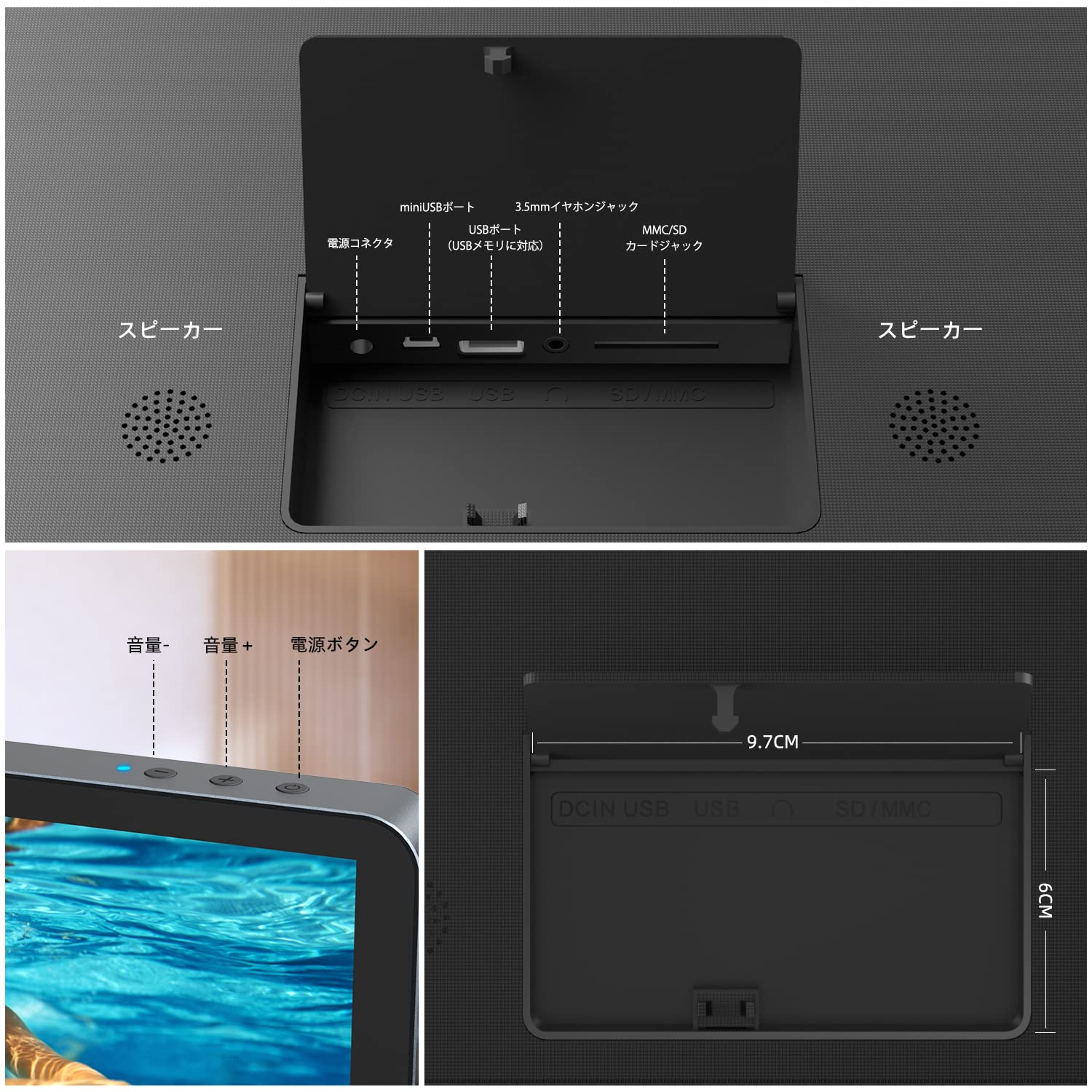 - 【方便的生活功能 SD/MMC卡/USB存储对应】:相框不仅照片,还搭载了日历、时钟模式、闹钟、天气预报、音乐播放(BGM可设定)等便利的生活功能。 相框主体附带32GB内存,SD/MMC卡/USB内存插槽/USB端口,可播放最大64GB的图像、视频、音乐数据。 另外,使用包装内容的”miniUSB数据线”,可以直接连接电脑并下载数据。