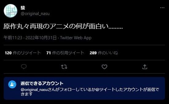 — 駿 (@original_nasu) October 11, 2022文章来源于互联网:チェンソーマン作画監督さん、叩かれすぎてついにブチギレ、ヤバいツイートをする「〇〇のアニメの何が面白い」