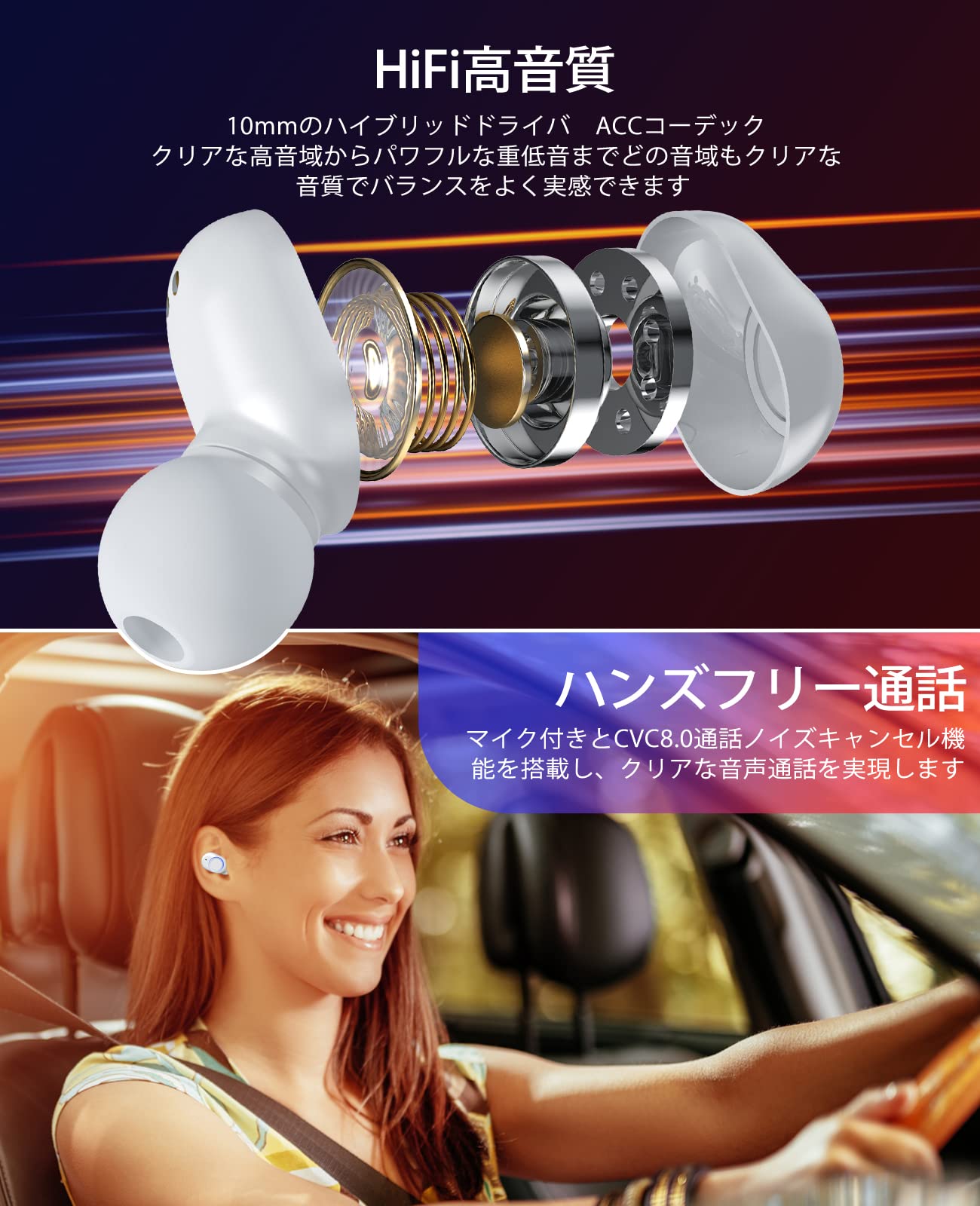 - 【クリアな音質&ハンズフリー通話】Bluetoothイヤホンは 10mmのハイブリッドドライバを採用しており、純音信号を高速伝送し、クリアな高音域からパワフルな重低音まで、どの音域でもクリアな音質バランスを感じられ、いつでもどこでもクリアな音楽を楽しめます。マイク付きとCVC8.0通話ノイズキャンセル機能を搭載しており、周りの騒音を最大限に打ち消して静かな環境を作ってくれ、クリアな音声通話を実現できます。
