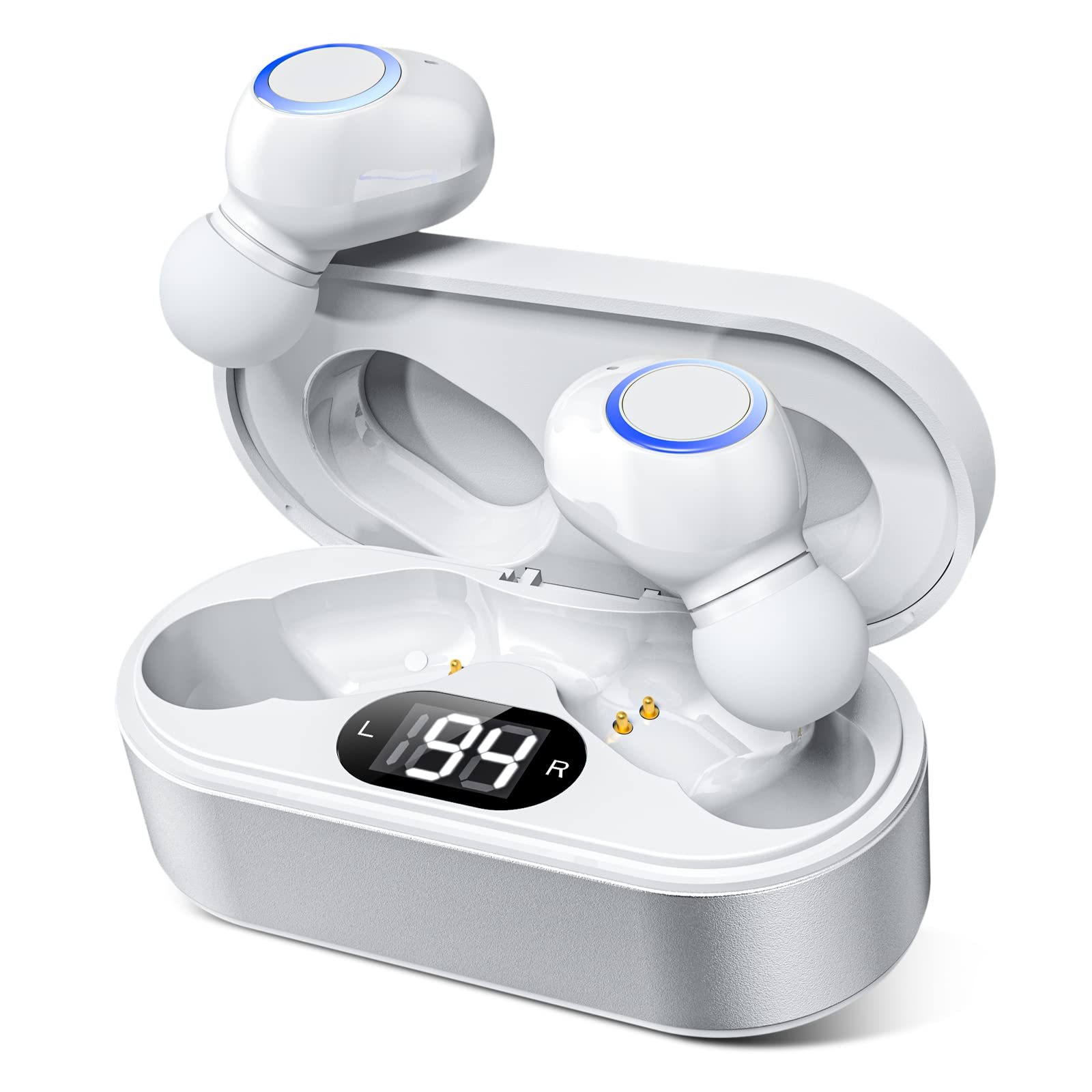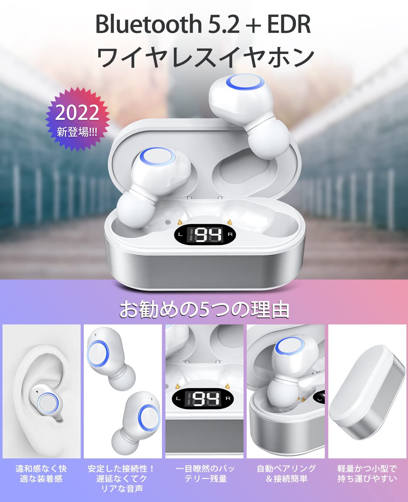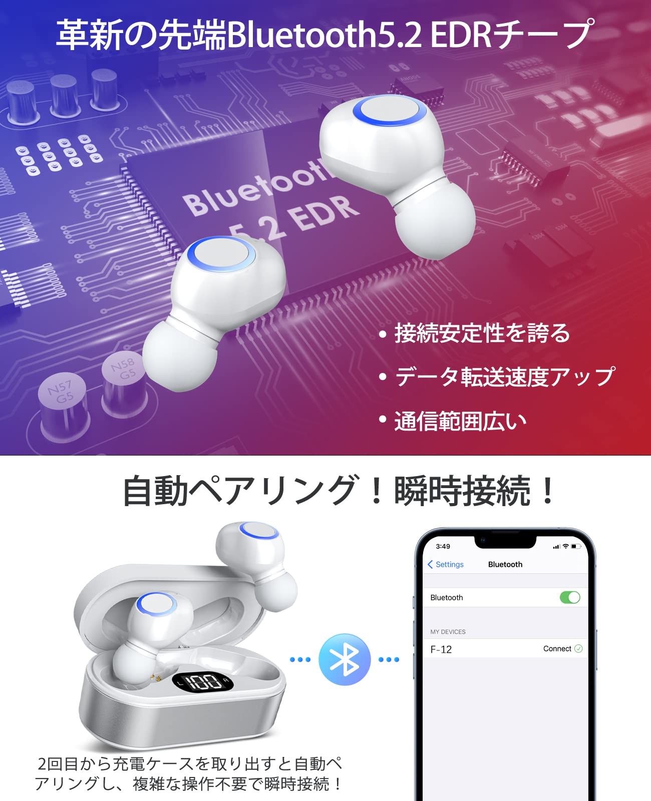 - 【新登場Bluetooth5.2+EDRを搭載するワイヤレスイヤホン】業界先端Bluetooth5.2 EDRチープを搭載するワイヤレスイヤホンは、Bluetooth信号が左右同時に伝送可能で周りの環境に影響されずより安定して接続し、従来のワイヤレスイヤホンの音切れや遅延などの弱点を軽減し、ゲームプレイや映画鑑賞のときに「画面と音がズレている」といったストレスから解放されます。更に、明瞭なLEDディスプレイ液晶表示により、バッテリー残量が一目瞭然で、より親切な使用感体験をもたらします