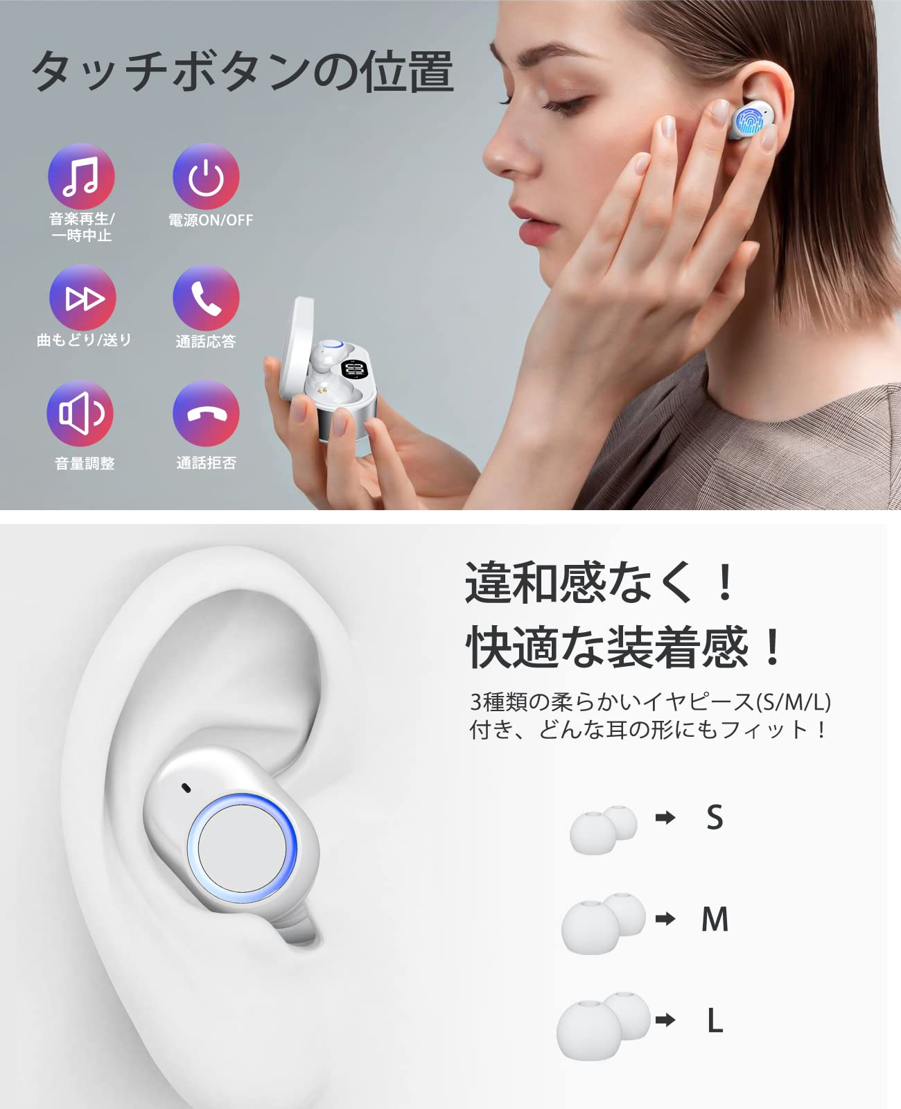 - 【自動ペアリング可能&操作簡単】本Bluetoothイヤホンは自動ペアリングにサポートしており、初回目ペアリングしたら、次回から充電ケースを取り出すと自動ペアリングモードに入って、複雑な操作不要で瞬時に接続できます。更に、完全分離式で、左右問わず、ケースから片耳のイヤホンを取り出すだけで簡単に片耳再生が可能です。イヤホンのタッチボタンを軽くタッチすると音楽の再生/一時停止、音量調節、通話応答/拒否などが操作できます。「アマゾンで人気のワイヤレスイヤホンが多くてどんなものを選べばいいか分からない」という初心者の方にもおすすめです