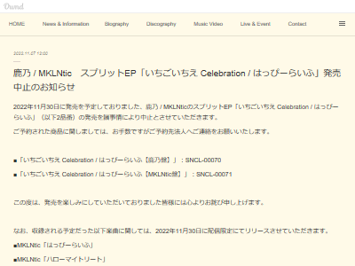 鹿乃 / MKLNtic スプリットEP「いちごいちえ Celebration / はっぴーらいふ」発売中止のお知らせ | 鹿乃 official site