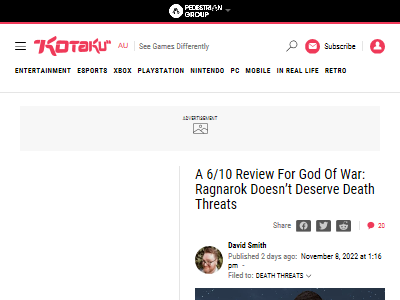 ・『ゴッド・オブ・ウォー ラグナロク』が11月9日に発売を迎えたが、本作を10点中6点と評したIGN韓国のSanghyun Bae記者に殺害予告が届いているようだ