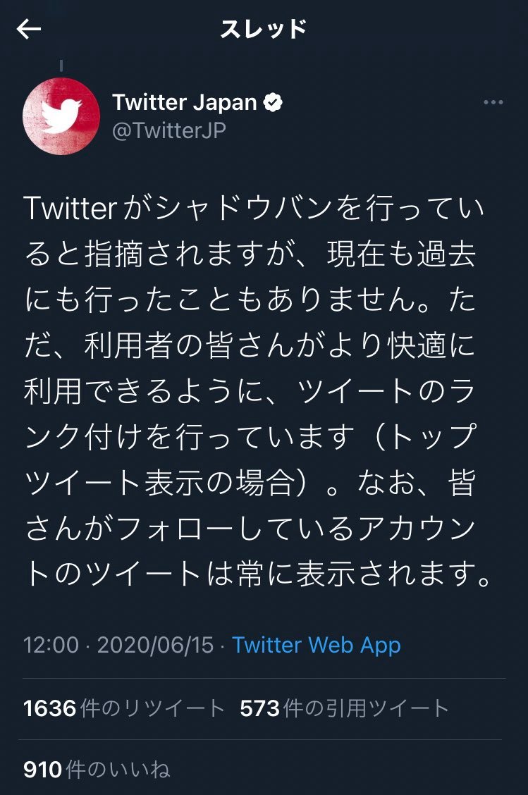 過去にシャドウバンを行ったことはないと断言したTwitter Japan公式さん、シャドウバンされてしまう pic.twitter.com/gaNjqNz65N