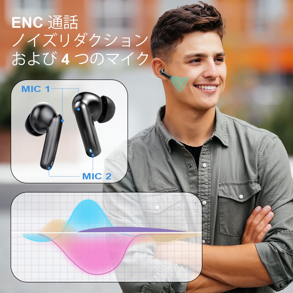 - 【ENC ノイズキャンセリング ブルートゥースイヤホン】 イヤホン ワイヤレスォンには、周囲の音を監視し、外部の音を分離して抑制するために連携する 4 つの内蔵の周囲ノイズ キャンセル マイクが備わっています。 街の騒音、交通騒音、風切り音など、周囲の騒音を 90% 以上除去するため、通話に集中して明瞭に聞くことができ、ヘッドホン bluetooth 通話品質が向上します。 オンライン授業や会議などの会話に最適!