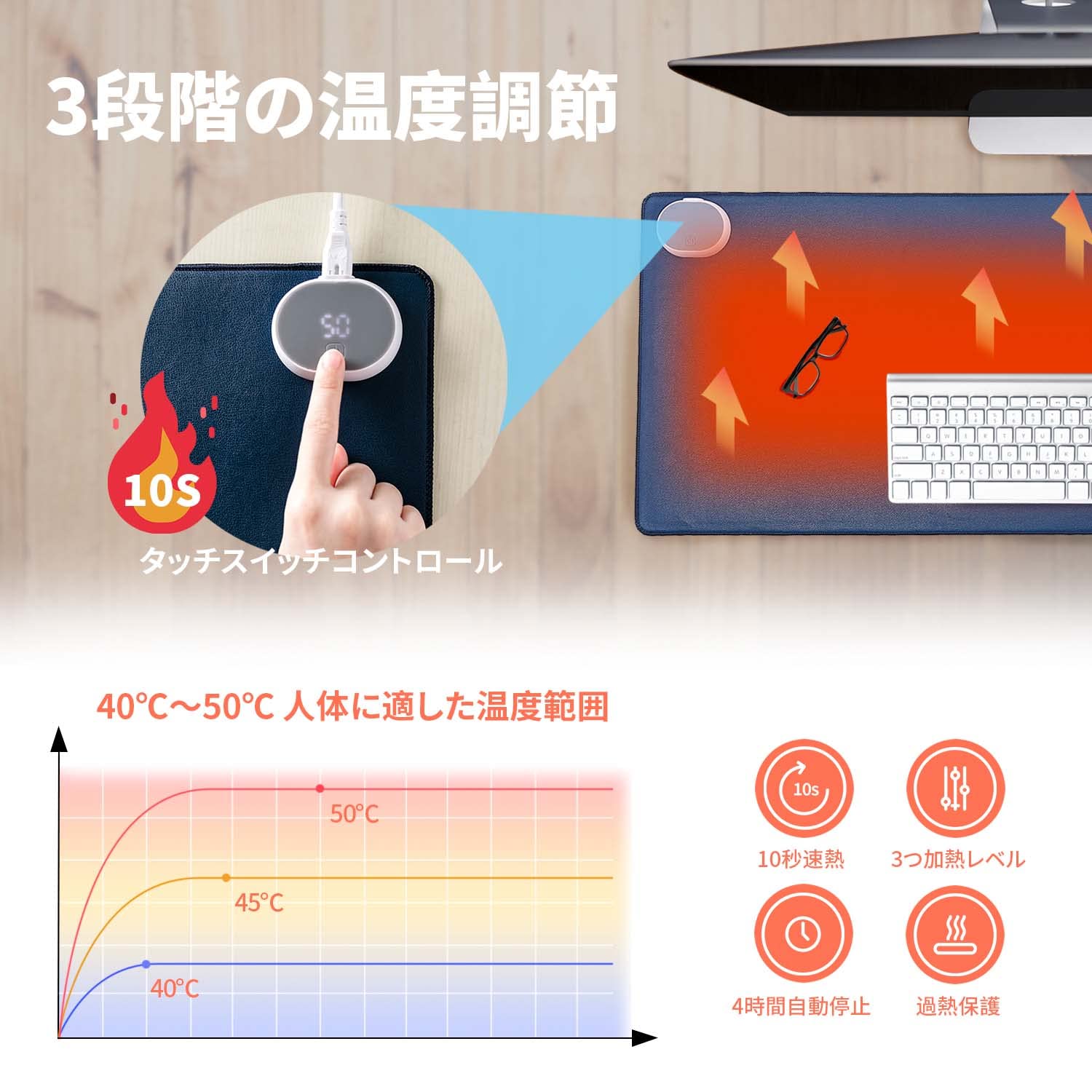 - 「3段階温度調節」3段階温度(40°C、45°C、50°C(±5°C)を調整でき、温度モード調整は50度(強)→45度(中)→40度(弱)の流れとなります。お好みの温度まで調節いただけます。スイッチはタッチパッド式で、触り心地がいいです。「オールシーズン適用」テーブルマットがあたためるから、冬時に手冷えの悩みを解消できます。季節の変わりに従い、電源を入れずに普通のテーブルマットとして使えます。環境にやさしい高級な皮革、耐久性があります。