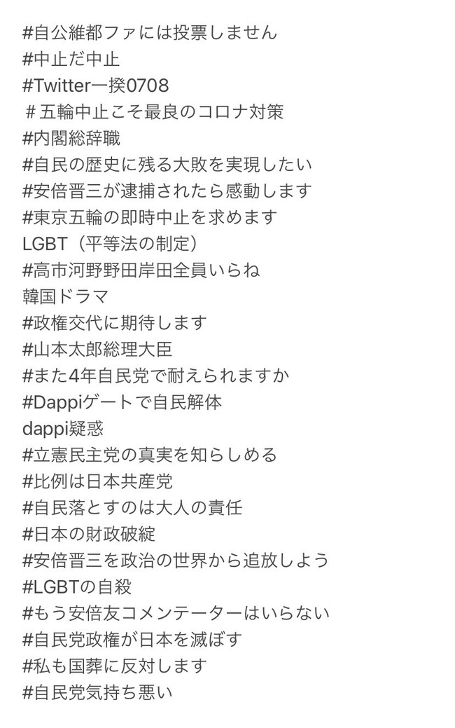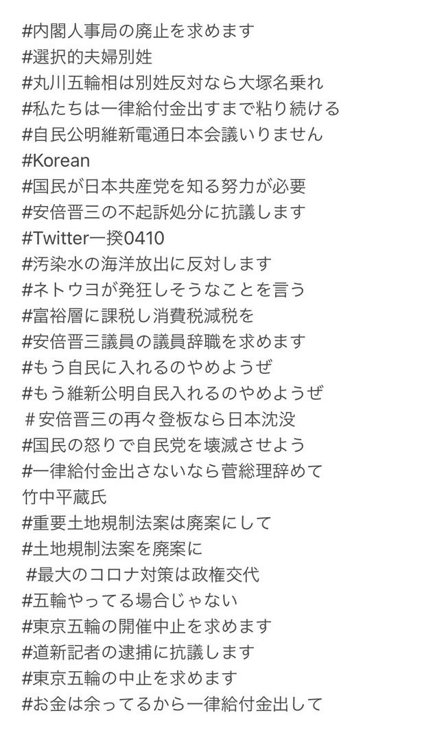 内容が偏ってるのは「私が鬱陶しいと思った」「興味がなかった」タグなので偏るのは当たり前だと思うんですけど(私が基準なので)、重要なのは「何度やっても消えなかった」という点と、タグたちの並びを見ると何か傾向を感じることでは。「保守界隈のタグも消えなかったよ」と証言があれば→