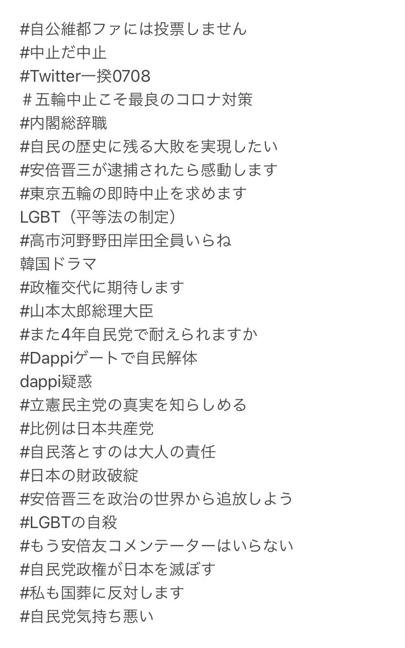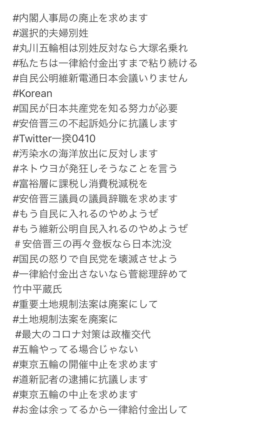 内容が偏ってるのは「私が鬱陶しいと思った」「興味がなかった」タグなので偏るのは当たり前だと思うんですけど(私が基準なので)、重要なのは「何度やっても消えなかった」という点と、タグたちの並びを見ると何か傾向を感じることでは。「保守界隈のタグも消えなかったよ」と証言があれば→