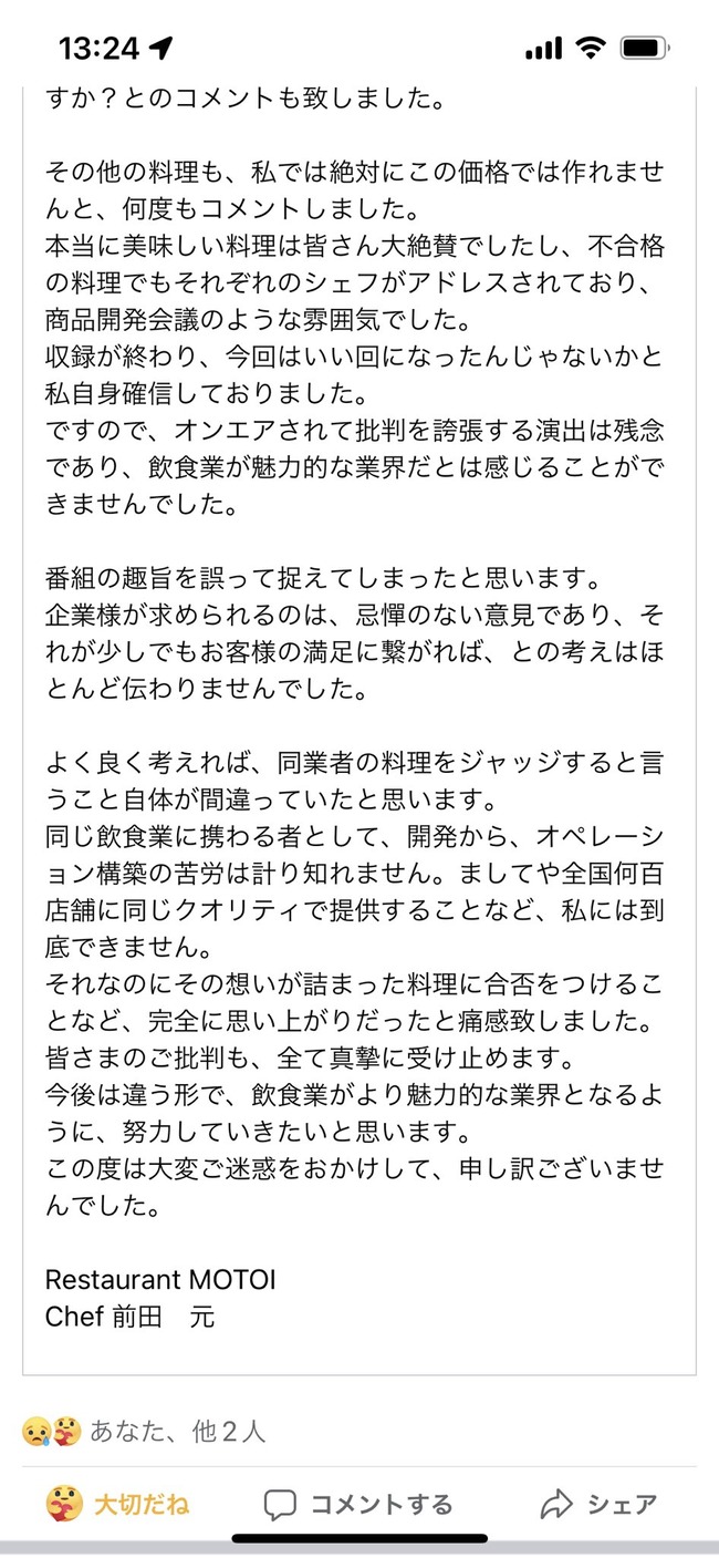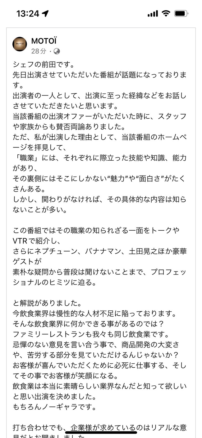 ジョブチューンに出演した京都・MOTOI前田元シェフが店のFacebookで出演についてのコメントを投稿。パンケーキのコメントについても触れています