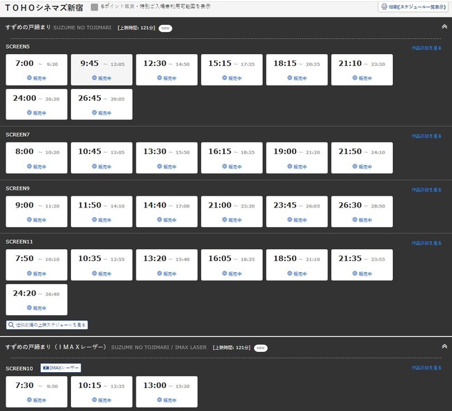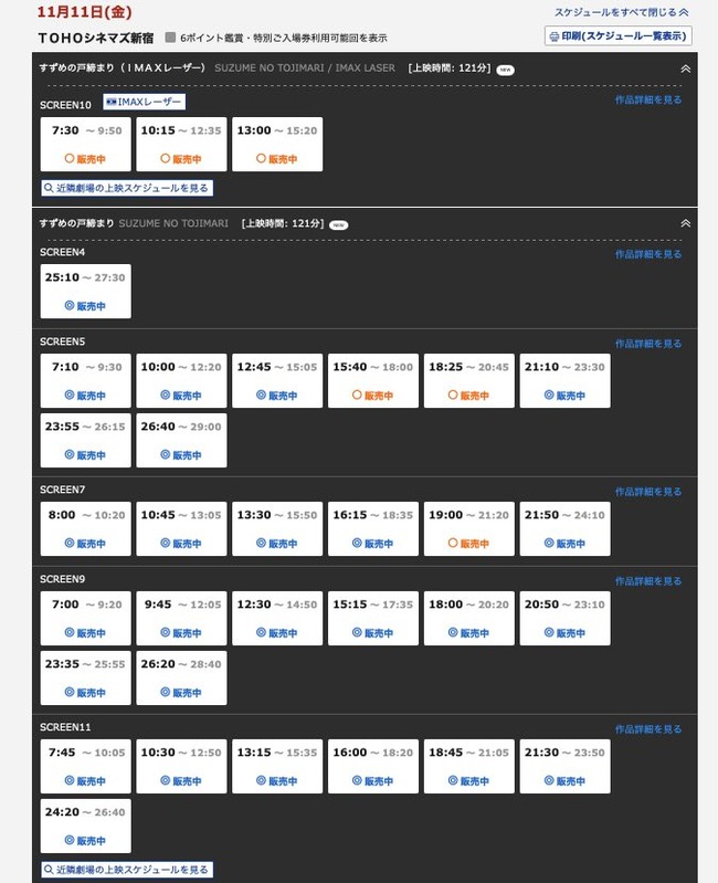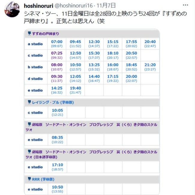 公開初週の「すずめの戸締まり」、TOHOシネマズ新宿の上映回数は30回。そして、TOHOシネマズ渋谷は、なんと全6スクリーン中4スクリーンで上映。https://t.co/ehkFOMitBj pic.twitter.com/YSefUSVOPC