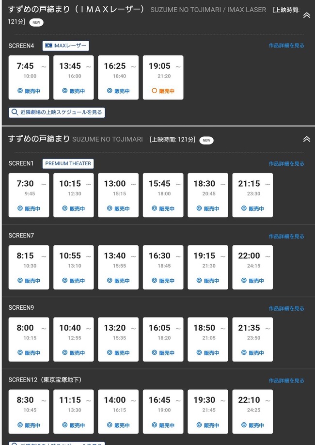 イオンシネマ福島(@ac_fukushima1)が「すずめの戸締まり」(@suzume_tojimari)を1日46回上映するらしいですが、