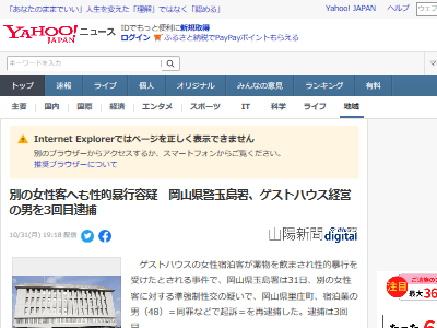 別の女性客へも性的暴行容疑 岡山県警玉島署、ゲストハウス経営の男を3回目逮捕