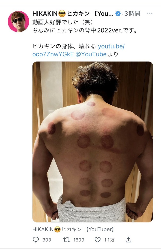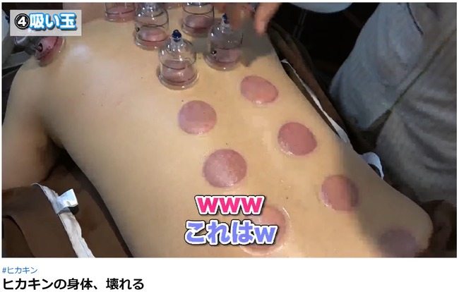 ヒカキンさんが自分で選んだわけではないとはいえ、吸い玉(カッピング)と水素整体って… pic.twitter.com/waIKHKESZu