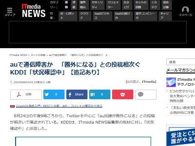从 8 月 24 日晚上 9 点左右开始,一系列帖子得到确认,主要是在 Twitter 上,称 au 线路将停止服务。 KDDI 回应 ITmedia NEWS 编辑部的采访时表示,他们正在“确认情况”。