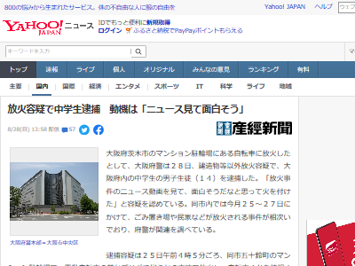 初中生涉嫌纵火被捕 以“看到新闻似乎很有趣”为动机(产经新闻)-雅虎新闻